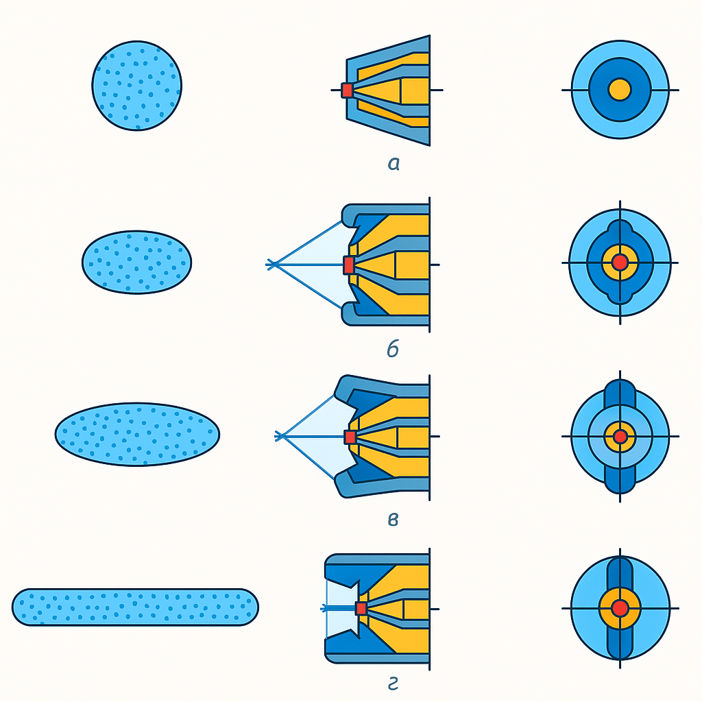 Конфигурация факела напрямую зависит от конструкции головки. Он может быть круглым либо плоским, вытянутым по ширине. Плоский факел создаётся за счёт боковых отверстий в воздушной головке, из которых под высоким давлением подаётся воздух, сжимая струю материала по бокам. Для более широкого и равномерного факела могут добавляться дополнительные отверстия, расположенные под углом, что позволяет точно регулировать геометрию факела. При этом подача воздуха к центральному и боковым каналам осуществляется раздельно, а значит — управление формой и размером факела максимально гибкое.